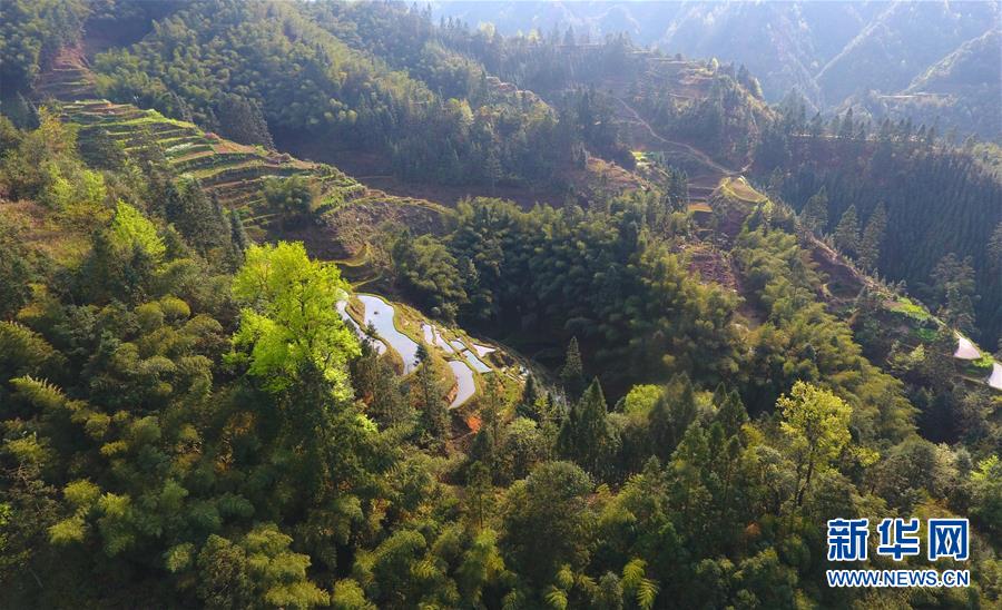 這是廣西融水苗族自治縣桿洞鄉(xiāng)黨鳩村的田園春色(3月29日無(wú)人機(jī)拍攝)。
