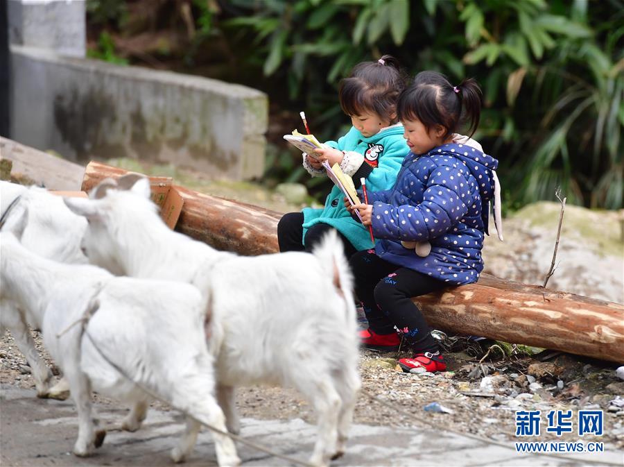 在黔桂烏英苗寨,兩位小朋友在路邊學(xué)習(xí)(3月26日攝)。