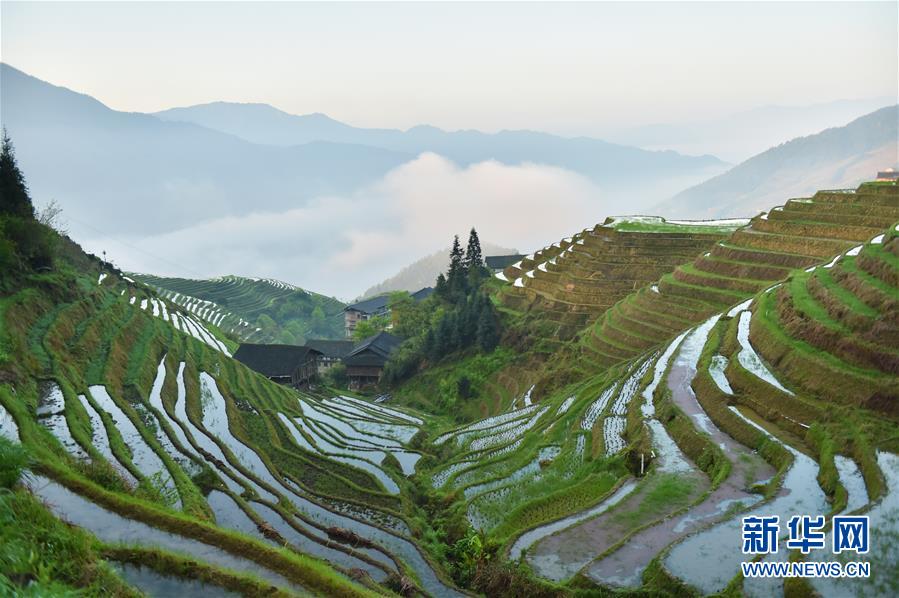 龍勝各族自治縣和平鄉(xiāng)平安村一景(4月7日攝)。連日降雨過后,廣西龍勝各族自治縣和平鄉(xiāng)平安村的壯族村寨迎來久違的朝陽(yáng)。 新華社記者 曹祎銘 攝
