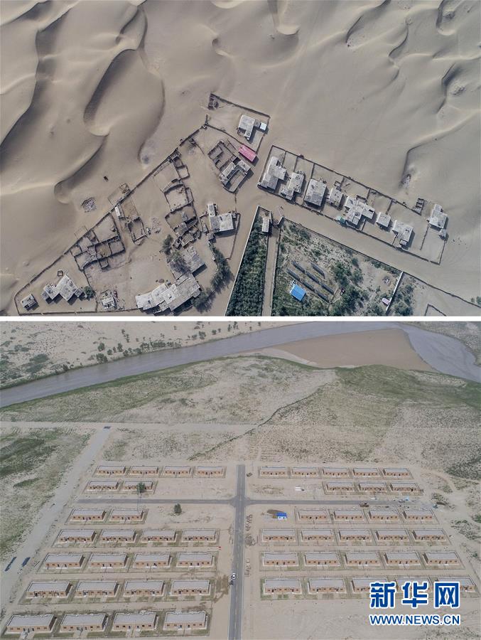 拼版照片:上圖為地處沙漠腹地的新疆于田縣達里雅布依鄉(xiāng)一處村落(2018年9月6日無人機拍攝);下圖為建設(shè)中的達里雅布依小鎮(zhèn)易地扶貧安置點(2018年9月8日無人機拍攝)。新華社記者 胡虎虎 攝