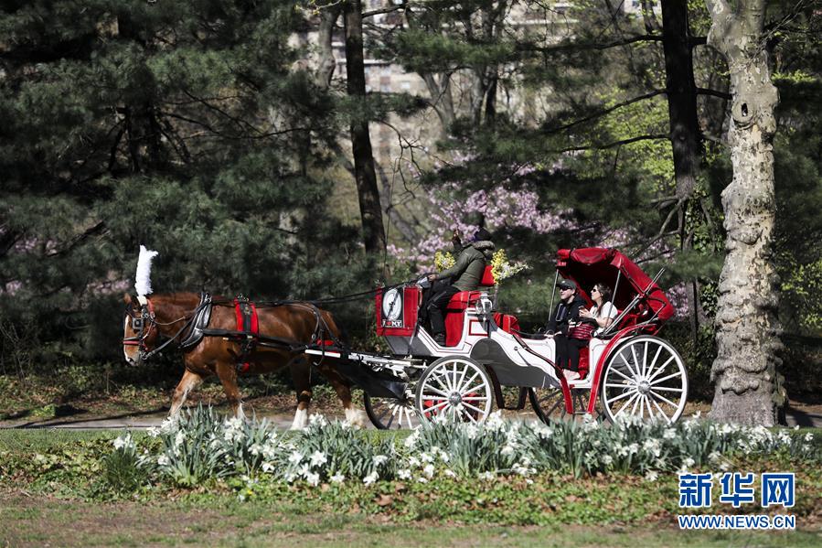 4月16日,人們?cè)诿绹?guó)紐約中央公園乘坐馬車游玩。 新華社記者 王迎 攝