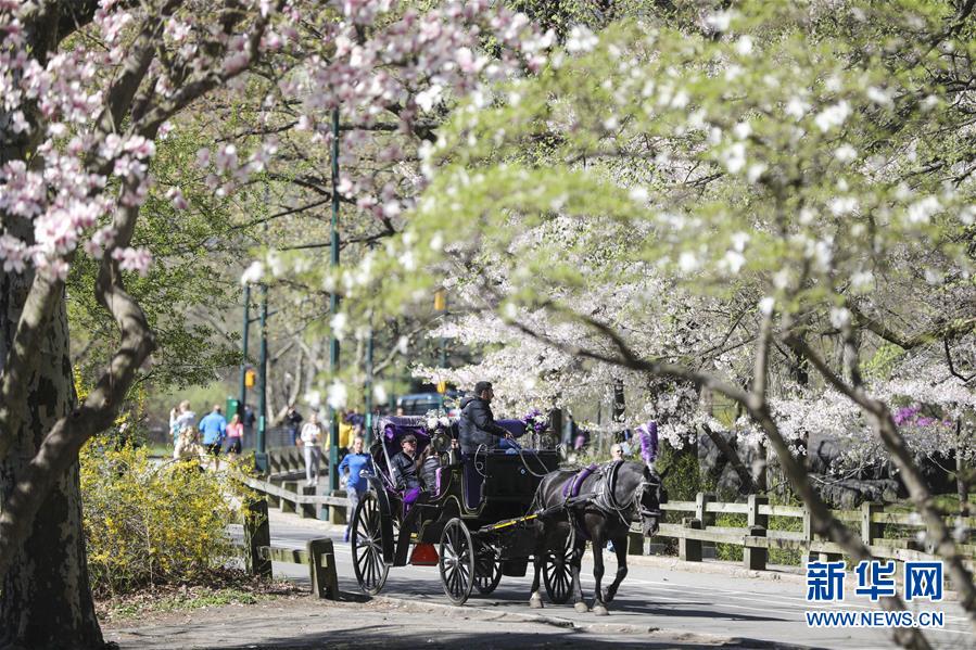 4月16日,人們在美國紐約中央公園乘坐馬車游玩。 新華社記者 王迎 攝