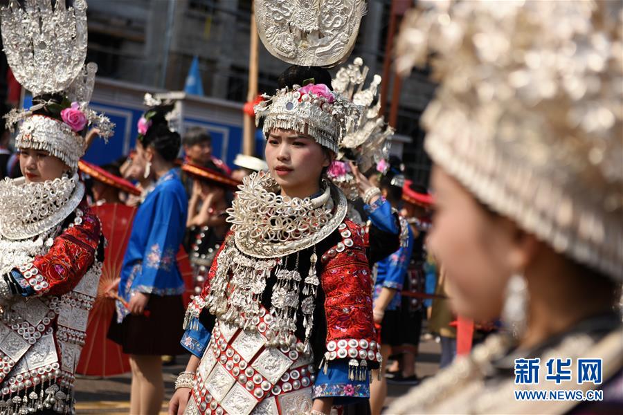 4月18日,臺江縣苗族群眾參加盛裝游演活動。 當(dāng)日,貴州省黔東南苗族侗族自治州臺江縣迎來一年一度的苗族姊妹節(jié)。節(jié)日期間將舉行苗族盛裝游演、千人長桌宴、千人游方體驗、苗族手工創(chuàng)意大賽等一系列活動。 姊妹節(jié)是臺江縣苗族同胞的傳統(tǒng)節(jié)日,2006年被列入第一批國家級非物質(zhì)文化遺產(chǎn)名錄。 新華社記者 楊文斌 攝