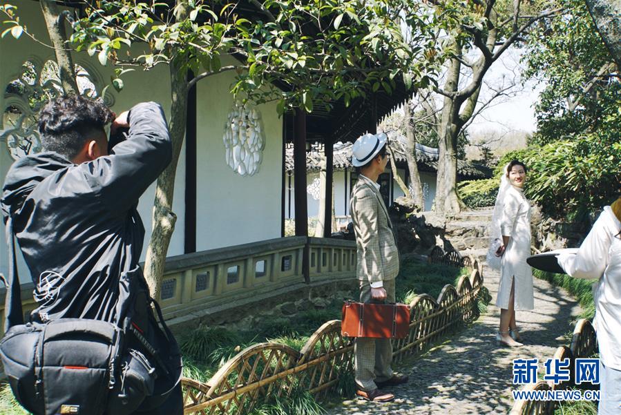 2019年4月1日,一對夫妻在中國蘇州滄浪亭內(nèi)拍婚紗照。2000年,滄浪亭和藝圃、耦園、獅子林、退思園作為蘇州古典園林的擴(kuò)展項(xiàng)目被列入聯(lián)合國教科文組織世界文化遺產(chǎn)名單。 新華社記者杜涓涓攝