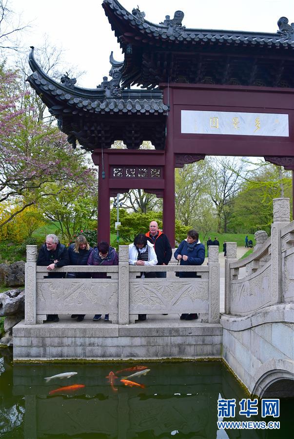 2019年4月13日,在德國曼海姆,游客在中式園林“多景園”內(nèi)觀魚。“多景園”位于曼海姆市路易森公園內(nèi),占地約6000平方米,建筑面積約1500平方米,是目前歐洲最為完整的中國古典園林建筑群落之一。 新華社記者逯陽攝