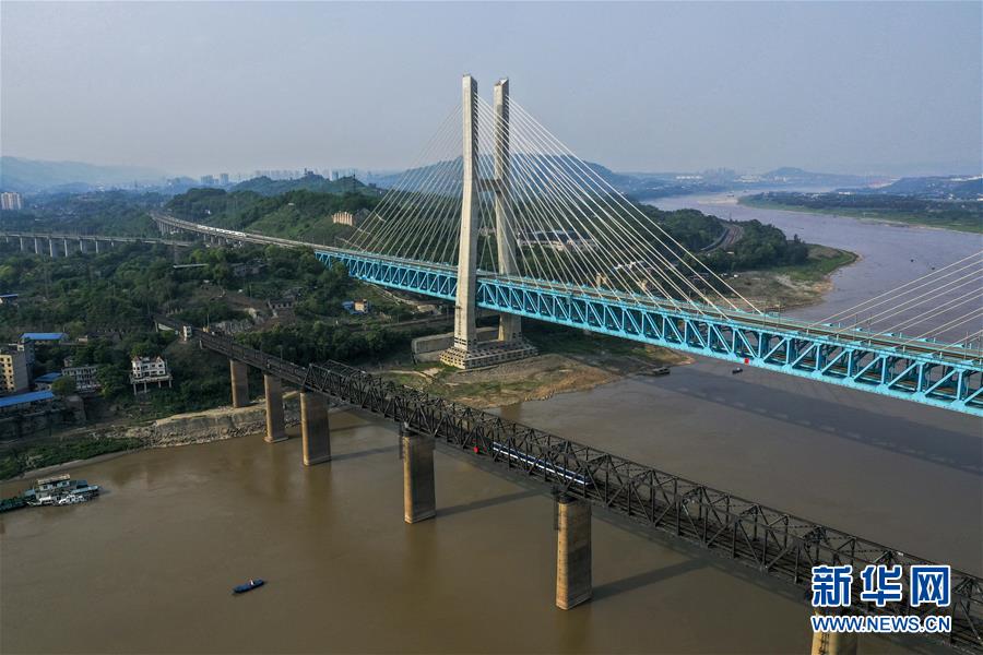 重慶白沙沱長江大橋(下)和新白沙沱長江特大橋(上)(4月23日無人機拍攝)。 4月23日下午5點40分,隨著重慶白沙沱長江大橋通行的最后一列客運列車順利通過,這座“服役”了59年的重慶首座長江大橋進入“退役”倒計時。4月24日后,所有列車將改線經(jīng)距白沙沱長江大橋約100米的新白沙沱長江特大橋通行,新橋“接力”老橋,運輸能力將得到大幅提升。 白沙沱長江大橋于1958年開工,1960年通過首趟列車,是繼武漢長江大橋之后的第二座長江大橋。 新華社記者 劉潺 攝