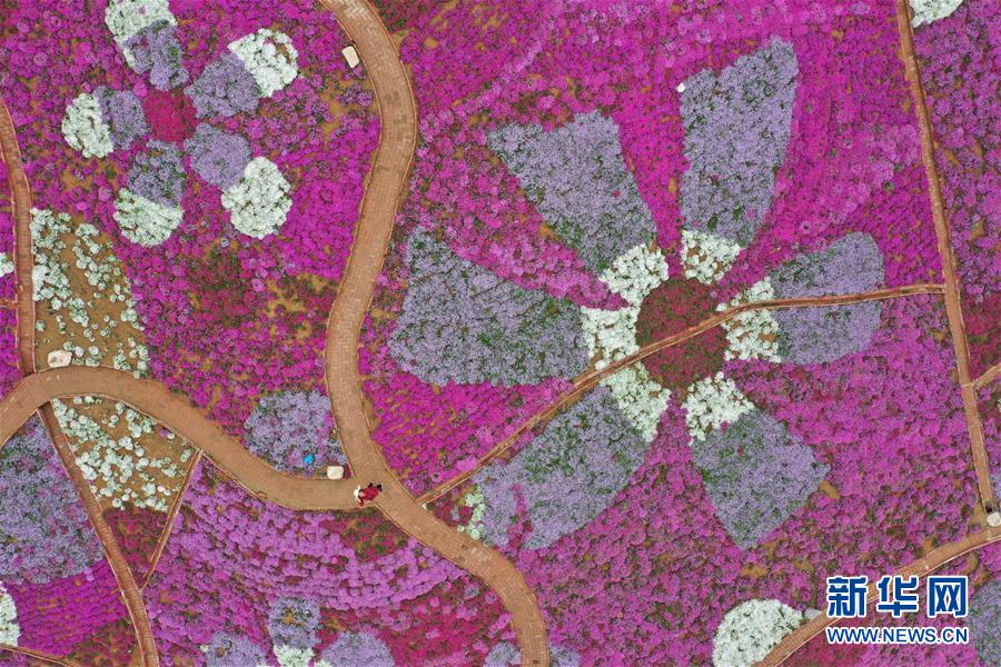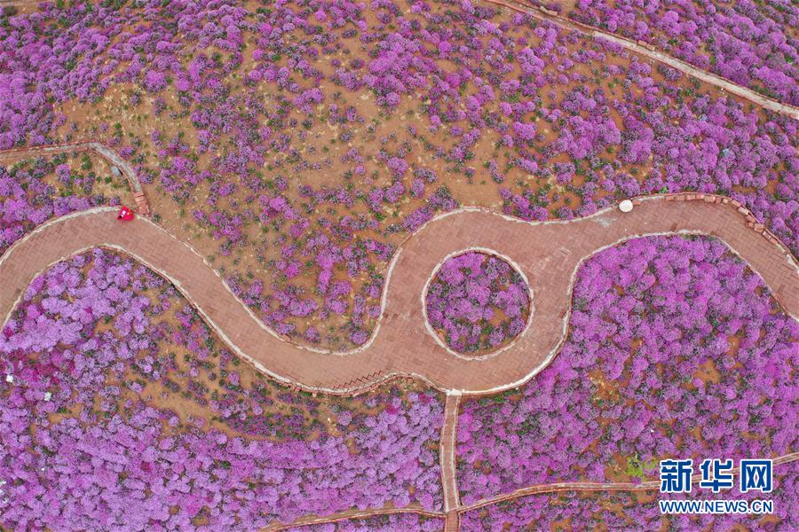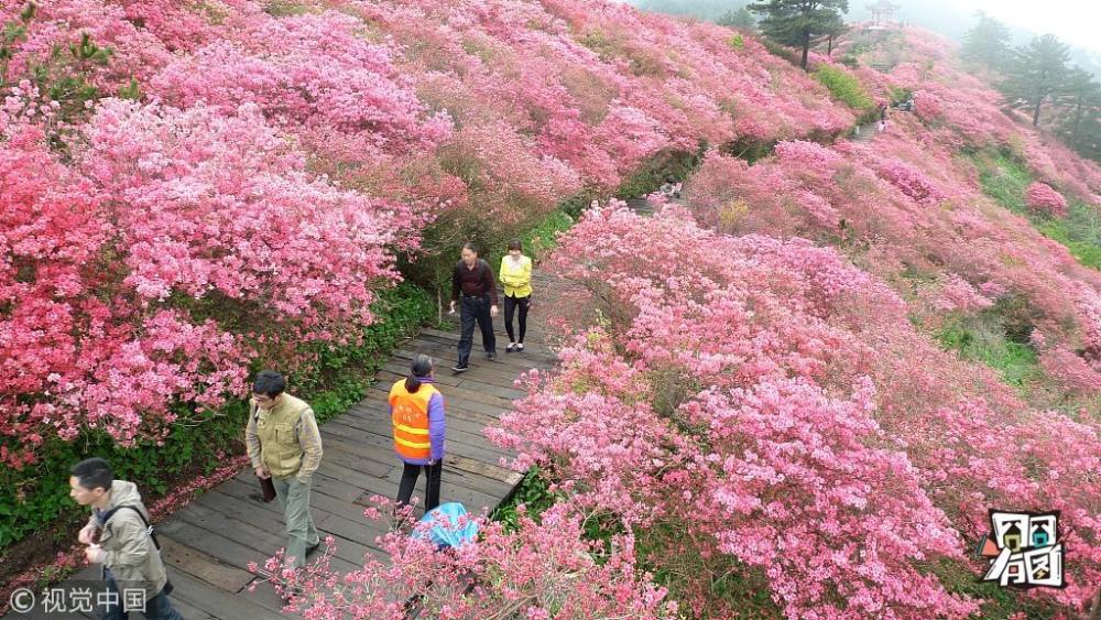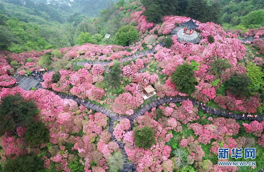 4月25日,游客在龜峰山杜鵑花海中游玩。 近日,湖北省麻城市龜峰山的10萬畝古杜鵑盛開,大量游客前來賞花觀景。 新華社記者 程敏 攝