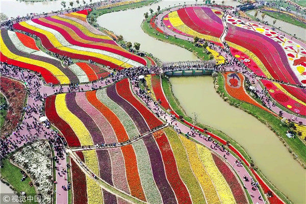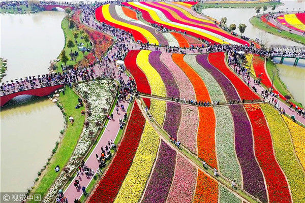 2019年4月6日,江蘇鹽城市大豐荷蘭花海的300萬株郁金香隨風盛開,吸引了眾多市民和游客前來觀賞。從空中看,一片片彩色的郁金香花田仿佛巨幅彩帶,將數百畝花海裝扮得分外美麗。楊素平/視覺中國