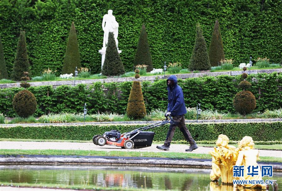 4月25日,在法國巴黎近郊,園丁在凡爾賽花園內(nèi)割草。新華社記者高靜攝
