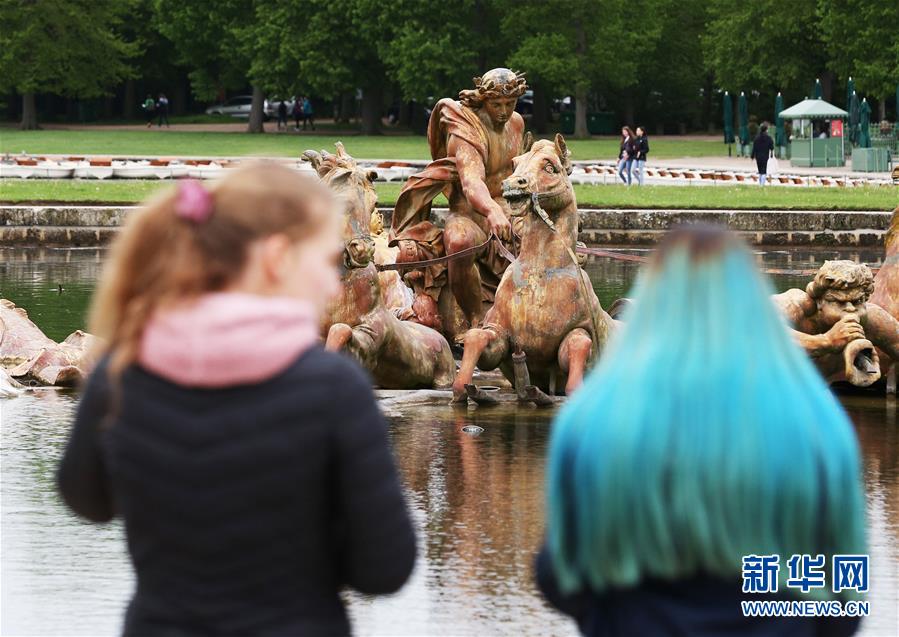 4月25日,在法國(guó)巴黎近郊,兩個(gè)女孩在凡爾賽花園內(nèi)欣賞噴泉。新華社記者高靜攝