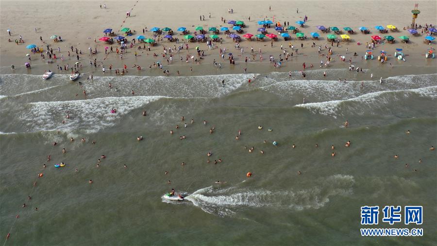 眾多游客在北海銀灘游玩(4月16日無人機(jī)拍攝)。新華社記者張愛林?jǐn)z