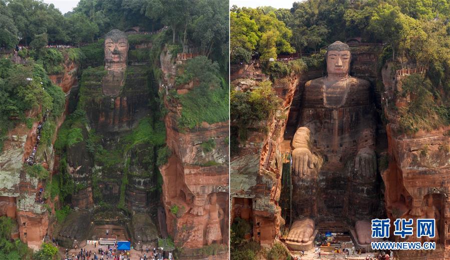 這是一張拼版照片:左圖為體檢與搶救性修復(fù)工作前的樂(lè)山大佛(2018年10月4日無(wú)人機(jī)拍攝);右圖為體檢與搶救性修復(fù)工作后的樂(lè)山大佛(3月29日無(wú)人機(jī)拍攝)。新華社記者 江宏景 攝
