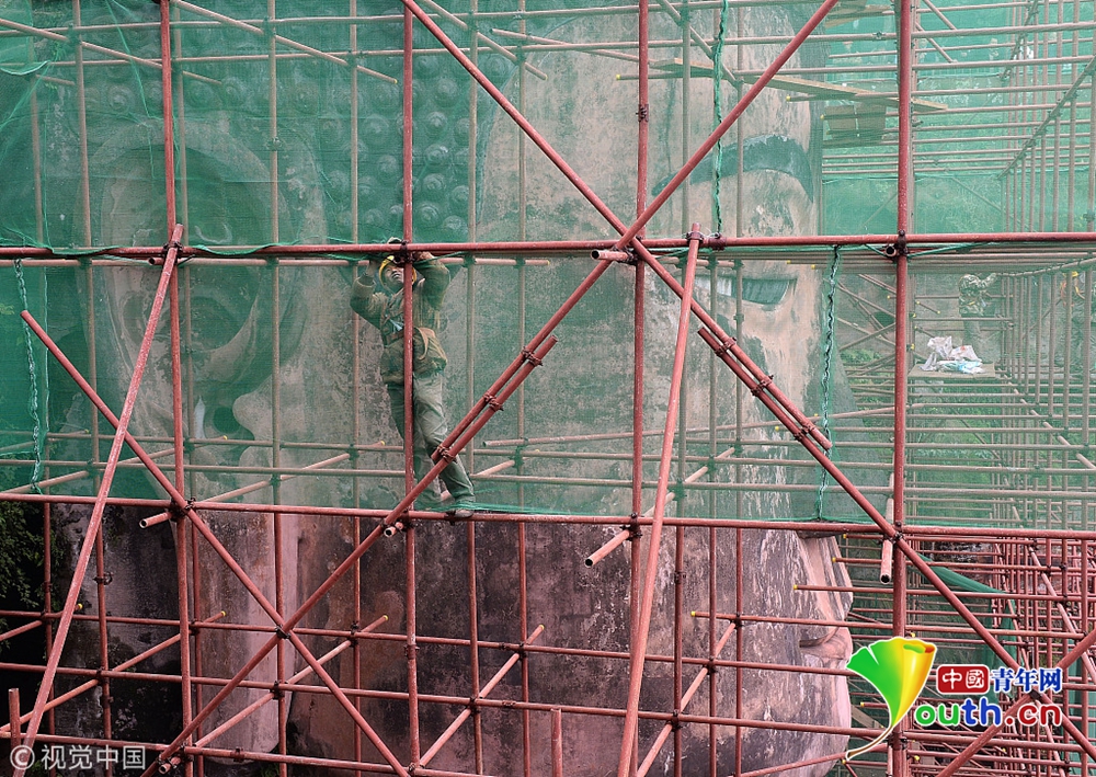 12月10日前后已逐步遮蔽大佛頭部,對(duì)頭面部進(jìn)行勘測(cè);12月底將開始拆除頭部腳手架,保證2019年元旦節(jié)之前,先露出佛頭,供游客觀賞。