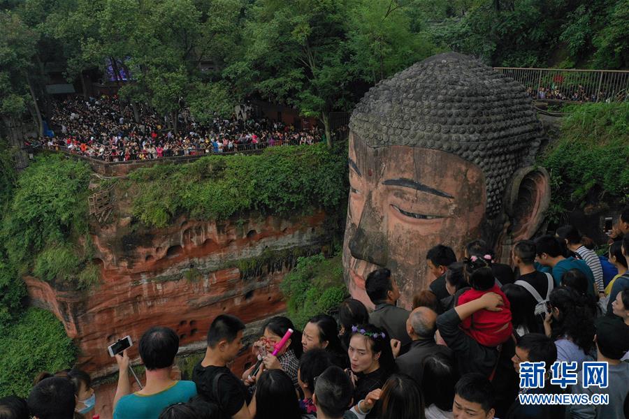 10月4日,游客在樂(lè)山大佛前排隊(duì)一睹大佛真容(無(wú)人機(jī)拍攝)。 新華社記者 江宏景 攝