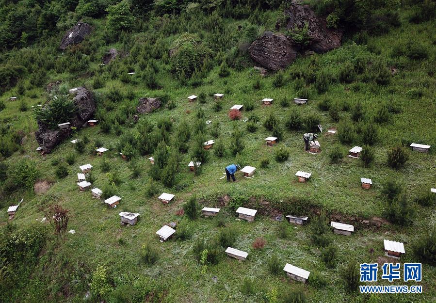 5月10日,在甘肅省隴南市徽縣大河店鎮(zhèn)硬灣村,蜂農(nóng)查看蜂箱情況(無人機(jī)拍攝)。 甘肅省隴南市徽縣大河店鎮(zhèn)硬灣村位于秦巴山區(qū)深處,2017年,在當(dāng)?shù)卣姆龀窒拢堁吕铣裁垧B(yǎng)殖農(nóng)民專業(yè)合作社成立,蜂農(nóng)們將傳統(tǒng)養(yǎng)蜂技藝和現(xiàn)代加工方式相結(jié)合,并通過電商等渠道打開銷路,有效帶動(dòng)了當(dāng)?shù)刎毨Т迕衩撠氈赂?。目前整個(gè)合作社共有蜂箱2000余個(gè),每箱每年可帶來三四千元的收入。 新華社記者 馬寧 攝