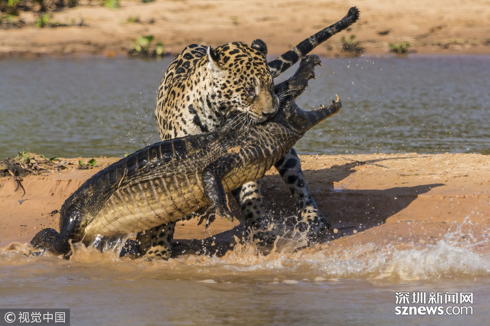 當(dāng)?shù)貢r(shí)間2013年8月25日,巴西潘特納爾,一頭雄性美洲豹攻擊了一條巴拉圭凱門鱷并與之纏斗。這只美洲豹預(yù)先躲在水中匍匐前進(jìn),然后突然出現(xiàn)把這只鱷魚震住,隨后用牙刺進(jìn)鱷魚的堅(jiān)硬的外殼中,將其拖入?yún)擦帧?/p>