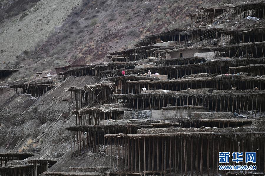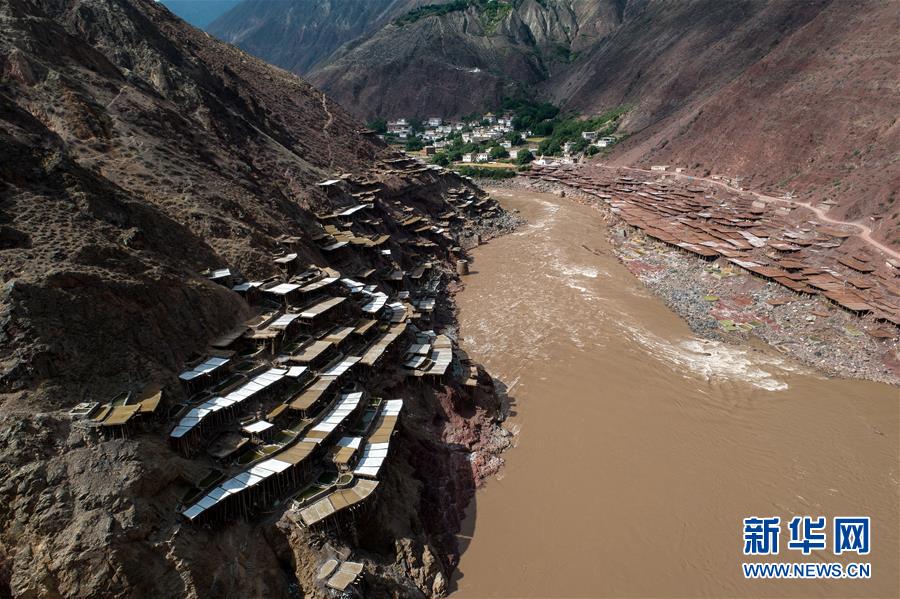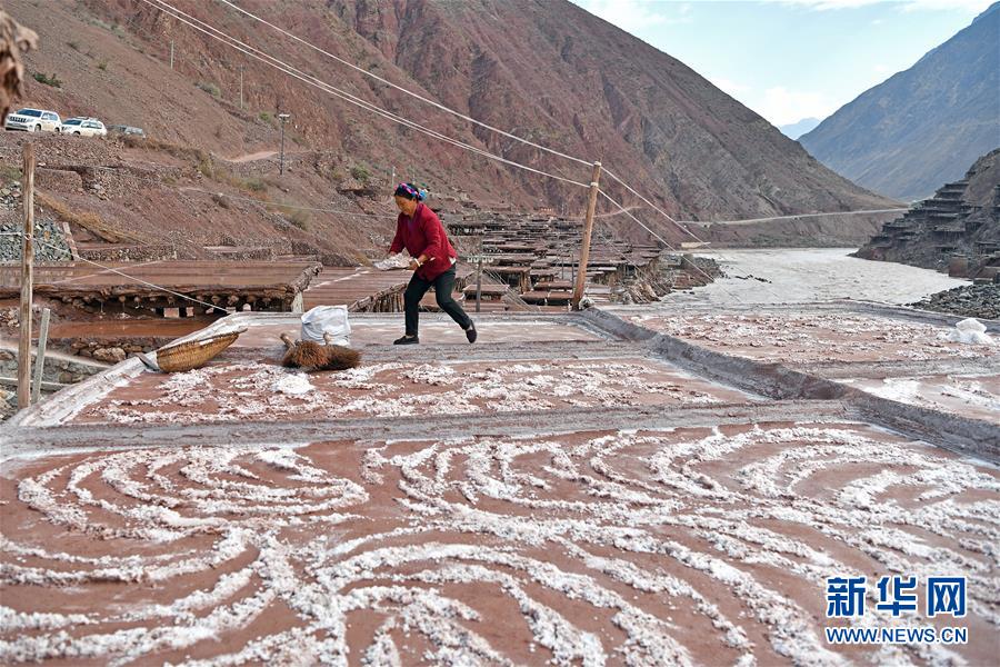 5月22日,西藏納西民族鄉(xiāng)加達村村民拉措在鹽田上收鹽。位于西藏昌都芒康縣瀾滄江畔的古鹽田,至今仍保持最原始的手工曬鹽方式。據(jù)史料記載,唐朝時期當?shù)鼐烷_始曬鹽。鹽田在瀾滄江兩岸依山而建,由多根木柱搭架,架上用透水性強的泥土鋪成平面夯實,當?shù)鼐用駨臑憸娼系柠}井、鹽池中取出鹵水倒入鹽田,經陽光蒸曬、風干,結晶成鹽。遠遠望去,鹽田錯落有致,田中鹵水宛若鏡面,形成壯麗奇觀。新華社記者李鑫 攝