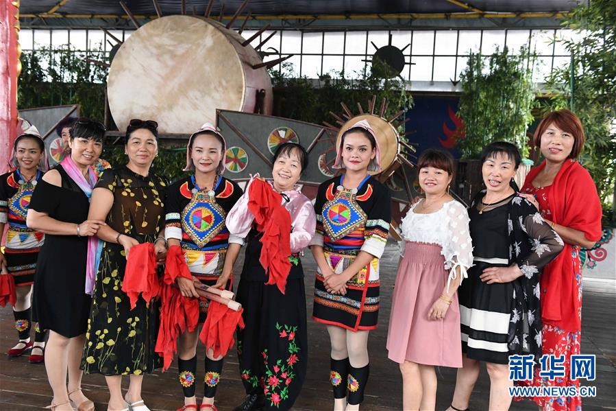 游客與基諾族大鼓舞演員合影(6月1日攝)。 在云南省西雙版納傣族自治州景洪市基諾山基諾族鄉(xiāng)的基諾族村寨,每天的基諾大鼓舞表演吸引了眾多游客前來觀賞體驗,帶動了基諾族群眾就業(yè)和增收。基諾族大鼓舞蘊涵豐富的歷史文化內(nèi)涵,已被列入國家級非物質(zhì)文化遺產(chǎn)保護名錄。 新華社記者 楊宗友 攝