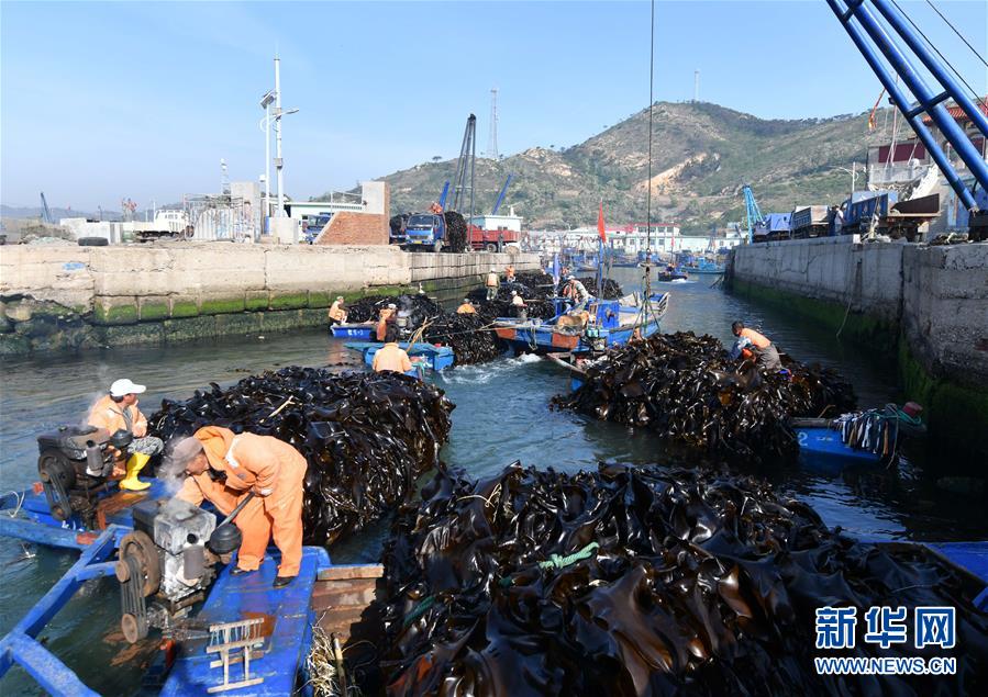 4月10日,霞浦縣長春鎮(zhèn)海帶養(yǎng)殖戶在埕塢碼頭吊運海帶。近日,福建省寧德市霞浦縣30余萬畝養(yǎng)殖海帶進入收獲季節(jié),當?shù)仞B(yǎng)殖戶搶抓晴好天氣,收獲海帶。海帶養(yǎng)殖是霞浦縣群眾增收致富的支柱產(chǎn)業(yè)。2018年該縣海帶產(chǎn)量14萬余噸。新華社記者 姜克紅 攝