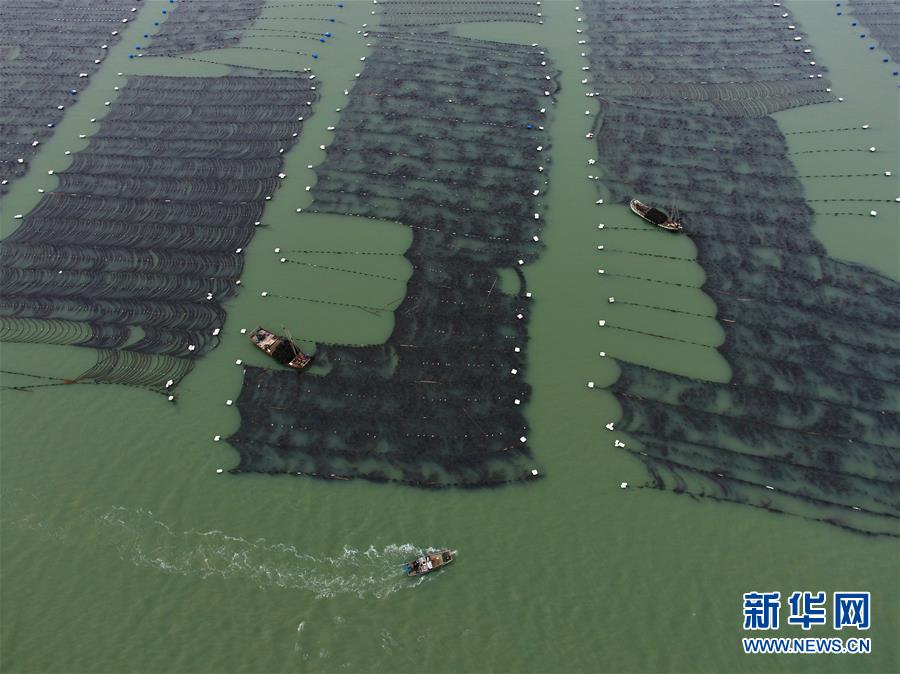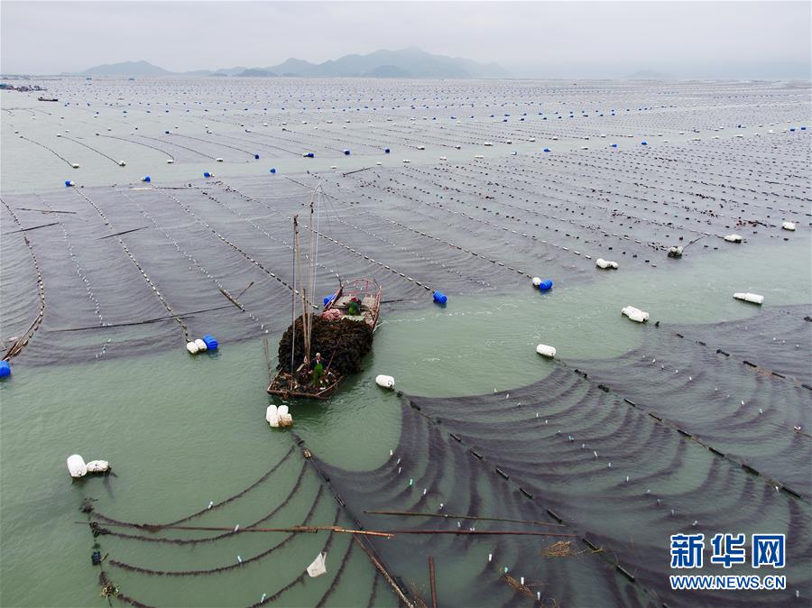 4月10日,霞浦縣長春鎮(zhèn)海域,海帶養(yǎng)殖戶在用船只收獲海帶(無人機拍攝)。近日,福建省寧德市霞浦縣30余萬畝養(yǎng)殖海帶進入收獲季節(jié),當?shù)仞B(yǎng)殖戶搶抓晴好天氣,收獲海帶。海帶養(yǎng)殖是霞浦縣群眾增收致富的支柱產(chǎn)業(yè)。2018年該縣海帶產(chǎn)量14萬余噸。新華社記者 姜克紅 攝