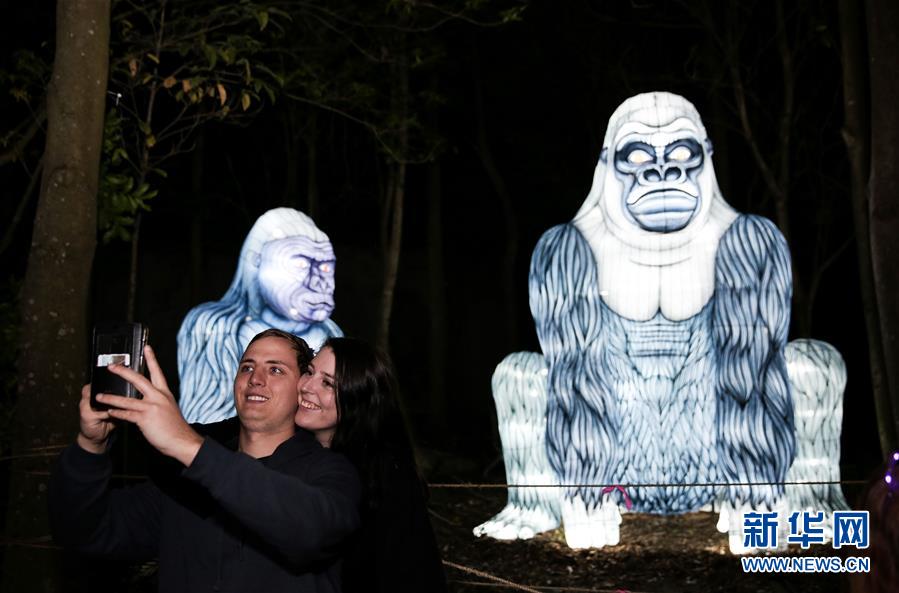 6月8日,在澳大利亞悉尼塔朗加動物園,游客在大猩猩造型花燈前合影。新華社記者 白雪飛 攝