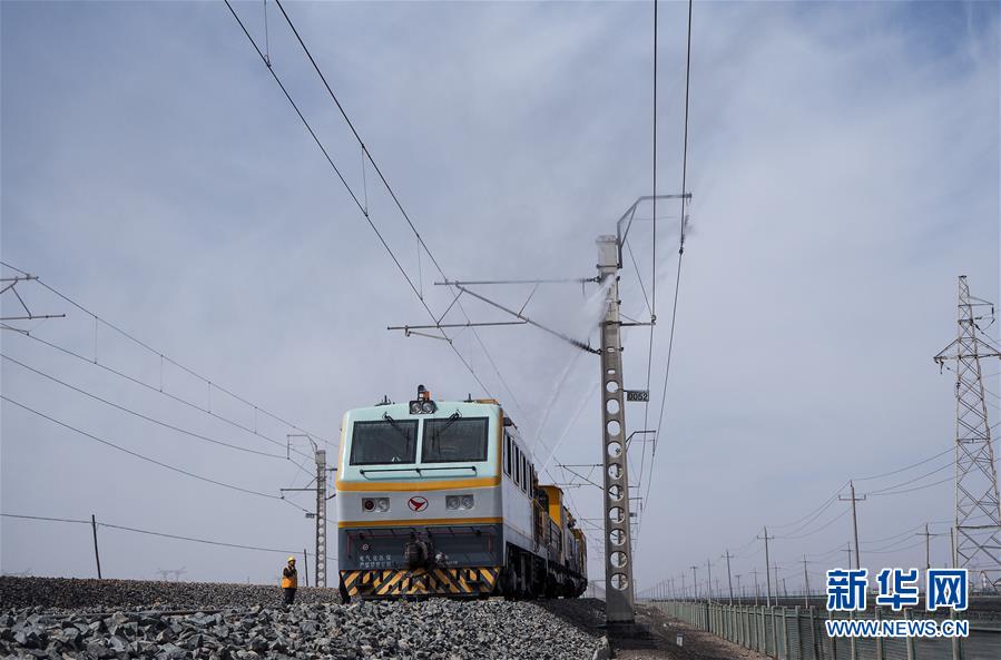 青藏鐵路公司西寧供電段格爾木大修車間的接觸網(wǎng)清洗車在清洗絕緣子(5月12日攝)。新華社記者白瑪央措攝
