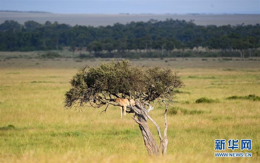 6月17日,在肯尼亞馬賽馬拉國(guó)家保護(hù)區(qū),一頭獅子在樹上休息。 新華社記者 李琰 攝