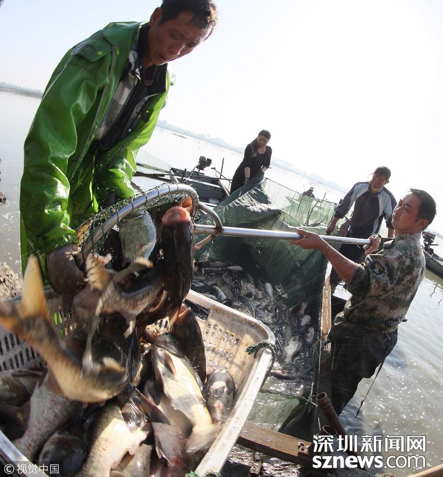 江蘇揚(yáng)州,漁夫?qū)Ⅳ~(yú)撈出過(guò)秤。