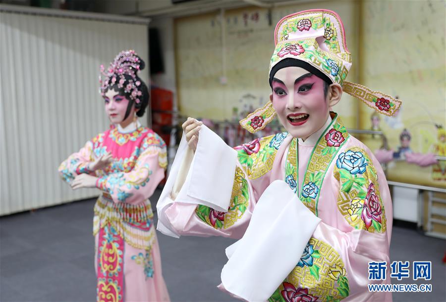 陸瑞徽(左)和利文喆在表演折子戲《艷曲醉周郎》(6月8日攝)。 聲輝粵劇推廣協(xié)會成立于2003年,是香港重要粵劇藝術(shù)團(tuán)體之一,致力于向青少年推廣粵劇。協(xié)會目前有兩個初班,3個中班,一個青少年班?;泟∮址Q“廣東大戲”,表演技藝包括“唱做念打”,即唱功、身段、臺詞、武打,主要流行于廣東、廣西和香港、澳門等地區(qū)。2009年,粵劇被列入聯(lián)合國教科文組織人類非物質(zhì)文化遺產(chǎn)代表作名錄,今年正逢十周年。 新華社記者 吳曉初 攝