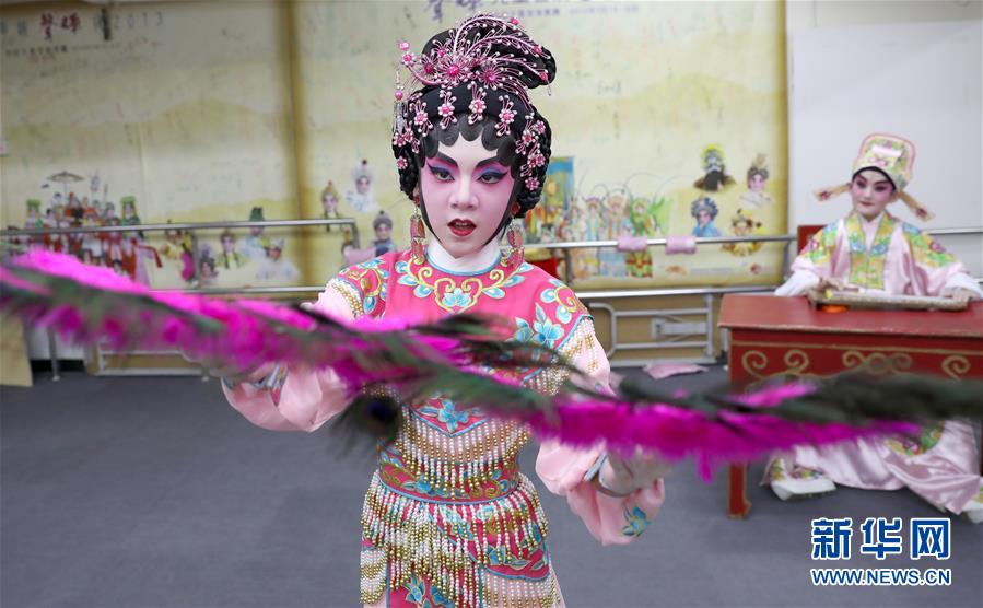 陸瑞徽(左)和利文喆在表演折子戲《艷曲醉周郎》(6月8日攝)。 聲輝粵劇推廣協(xié)會成立于2003年,是香港重要粵劇藝術(shù)團體之一,致力于向青少年推廣粵劇。協(xié)會目前有兩個初班,3個中班,一個青少年班?;泟∮址Q“廣東大戲”,表演技藝包括“唱做念打”,即唱功、身段、臺詞、武打,主要流行于廣東、廣西和香港、澳門等地區(qū)。2009年,粵劇被列入聯(lián)合國教科文組織人類非物質(zhì)文化遺產(chǎn)代表作名錄,今年正逢十周年。 新華社記者 吳曉初 攝