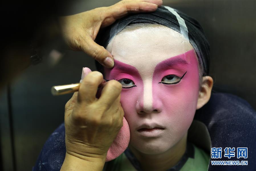 粵劇小演員陸瑞徽在畫(huà)經(jīng)典“紅白臉”妝容(6月8日攝)。 聲輝粵劇推廣協(xié)會(huì)成立于2003年,是香港重要粵劇藝術(shù)團(tuán)體之一,致力于向青少年推廣粵劇。協(xié)會(huì)目前有兩個(gè)初班,3個(gè)中班,一個(gè)青少年班?;泟∮址Q(chēng)“廣東大戲”,表演技藝包括“唱做念打”,即唱功、身段、臺(tái)詞、武打,主要流行于廣東、廣西和香港、澳門(mén)等地區(qū)。2009年,粵劇被列入聯(lián)合國(guó)教科文組織人類(lèi)非物質(zhì)文化遺產(chǎn)代表作名錄,今年正逢十周年。 新華社記者 吳曉初 攝