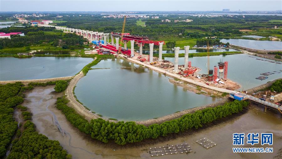 這是7月6日無人機拍攝的湛江調順跨海大橋東岸移動模架施工現(xiàn)場。 新華社記者 劉大偉 攝