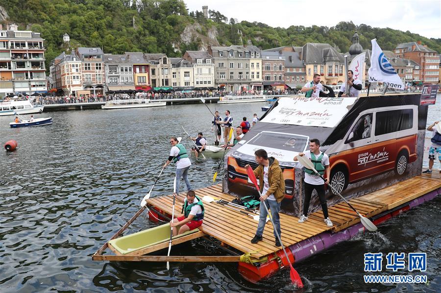 8月15日,在比利時(shí)南部小城迪南的默茲河上,人們參加“浴缸劃船節(jié)”的表演。