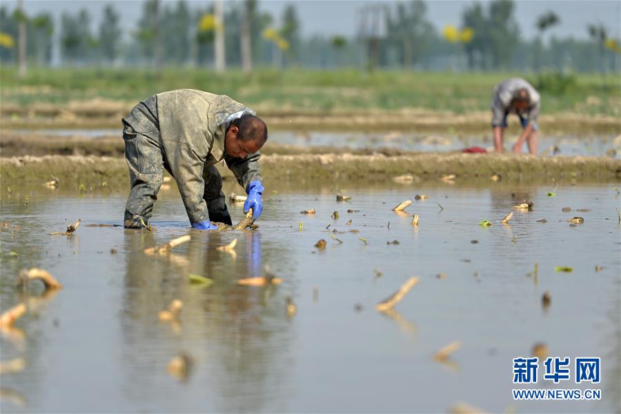 5月14日,河北省隆堯縣東良鎮(zhèn)澤畔村的農民在種植蓮藕。新華社記者牟宇攝