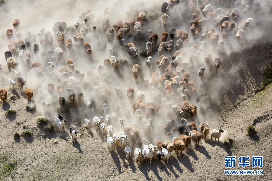 6月6日,轉(zhuǎn)場(chǎng)的牲畜行走在牧道上。新華社記者 丁磊 攝