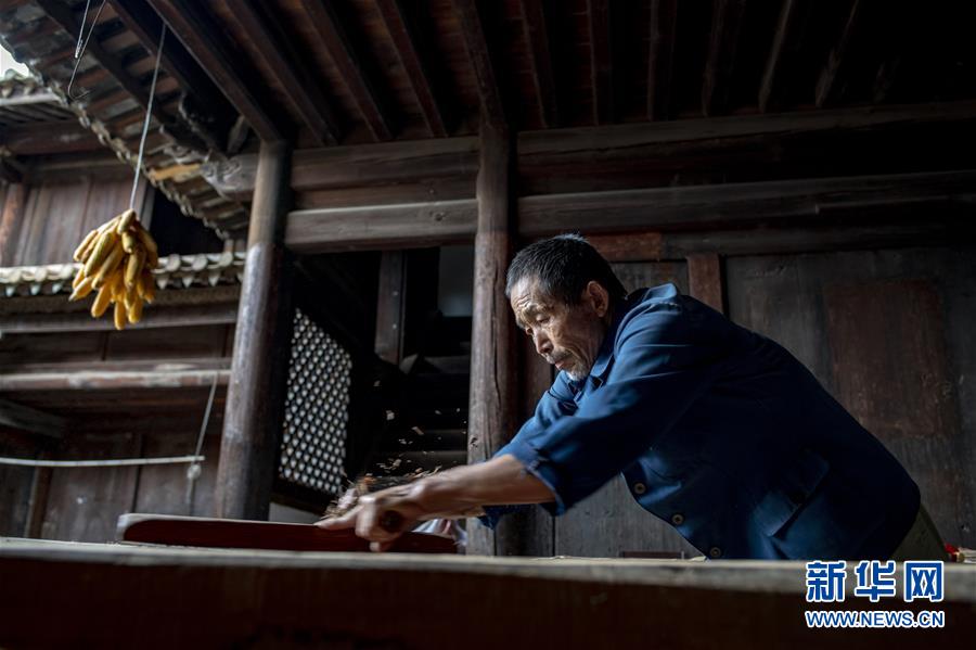73歲的石屏縣異龍鎮(zhèn)符家營(yíng)村村民楊國(guó)保在家中制作村里修整老屋所需的木梁(8月8日攝)。新華社記者 江文耀 攝