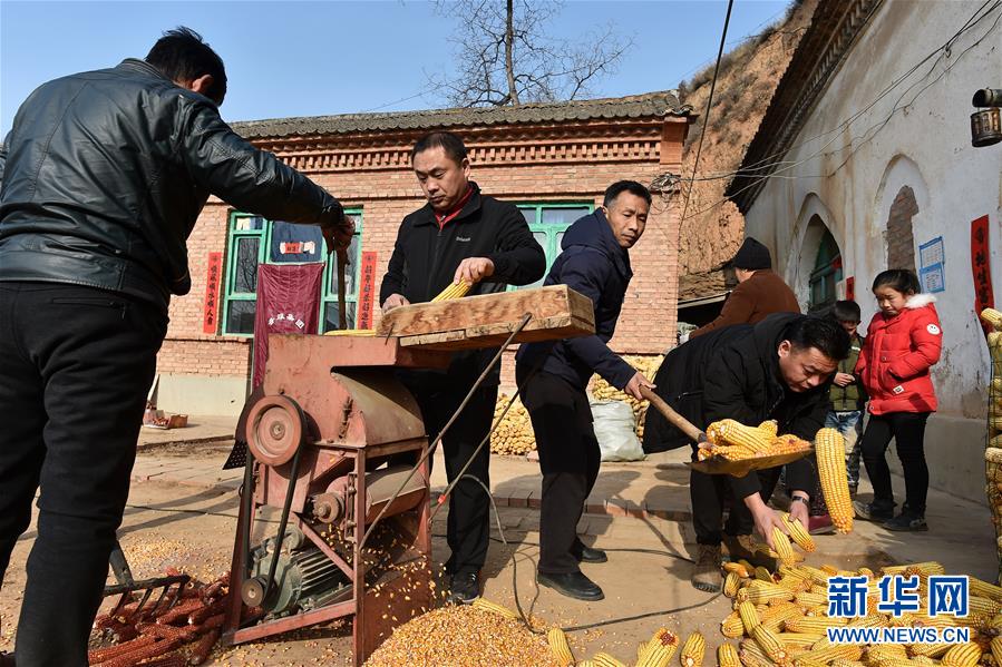 在武鄉(xiāng)縣大有鄉(xiāng)王莊溝村,駐村第一書記靳建中(左二)和扶貧工作隊隊員徐乃勤(左三)、常建林(左四)在村民家里幫助村民給玉米脫粒(2月17日攝)。 新華社記者 詹彥 攝