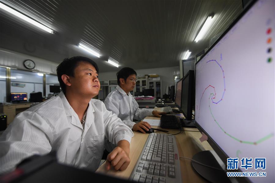 在明安圖觀測基地,科研人員周志超(前)和譚程明在觀測室內(nèi)工作(7月27日攝)。 新華社記者 劉磊 攝