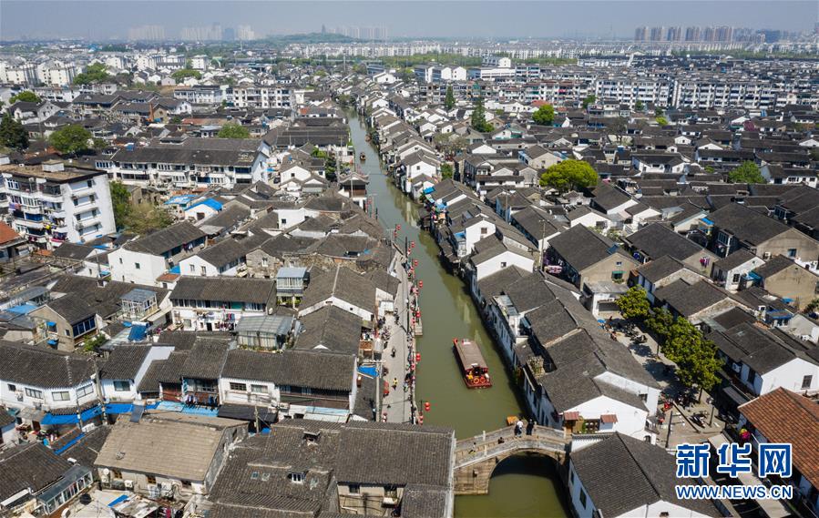 圖為4月18日無人機(jī)拍攝的蘇州山塘街及城景。 新華社記者 李響 攝