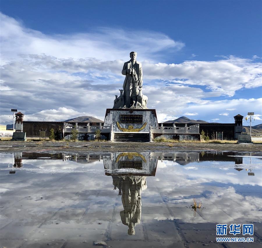 這是在青海省玉樹(shù)藏族自治州治多縣用手機(jī)拍攝的“環(huán)保衛(wèi)士”杰?!に髂线_(dá)杰的雕像(9月12日攝)。新華社記者 鄒樂(lè) 攝