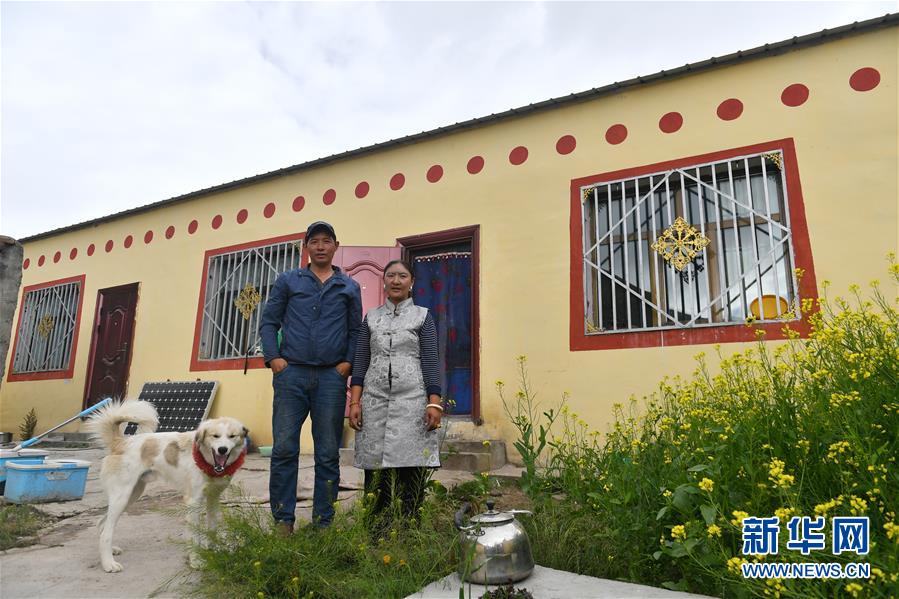 在青海省玉樹(shù)藏族自治州治多縣治渠鄉(xiāng)同卡村,村民昂文西讓和妻子布沙措江卓瑪站在易地搬遷的新家院子里合影(9月12日攝)。新華社記者 孫瑞博 攝