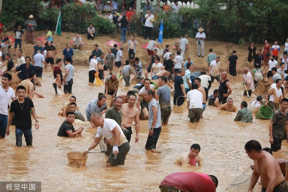 有人撒魚網(wǎng),有人用網(wǎng)兜,還有人直接徒手捉魚,手段各異引路人圍觀。