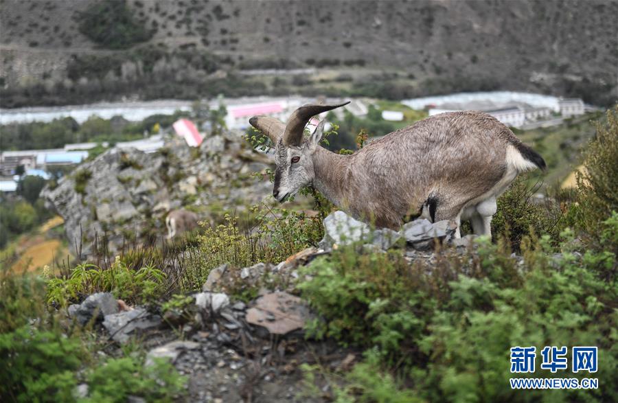 一群巖羊在西藏山南市洛扎縣色鄉(xiāng)海拔4000米左右的盤(pán)山路邊,悠閑地吃著野果青草(9月22日攝)。 新華社記者 晉美多吉 攝