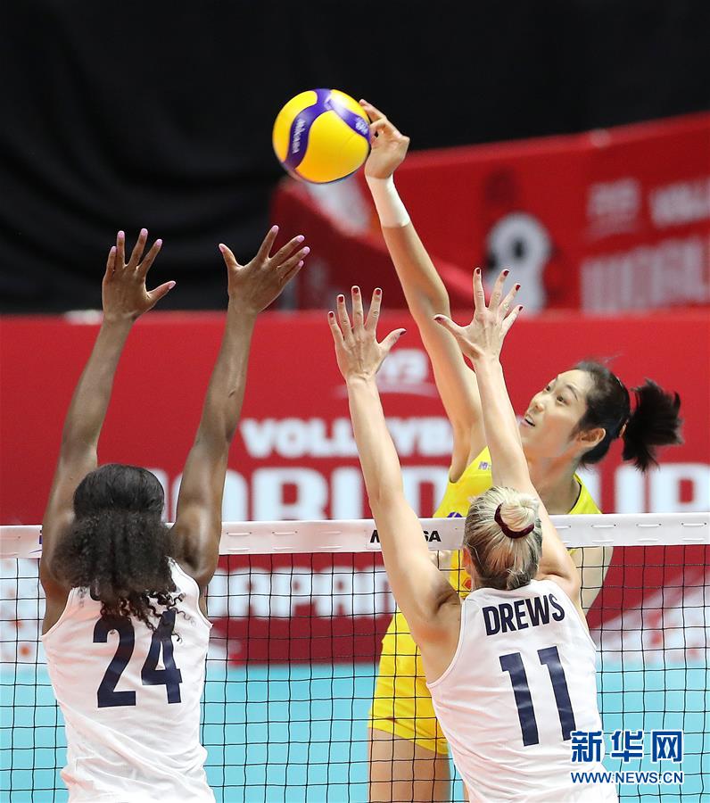 9月23日,中國隊(duì)球員朱婷(右)在比賽中扣球。當(dāng)日,在日本札幌舉行的2019年女排世界杯賽第二階段A組循環(huán)賽中,中國隊(duì)以3比0戰(zhàn)勝美國隊(duì)。新華社記者杜瀟逸攝
