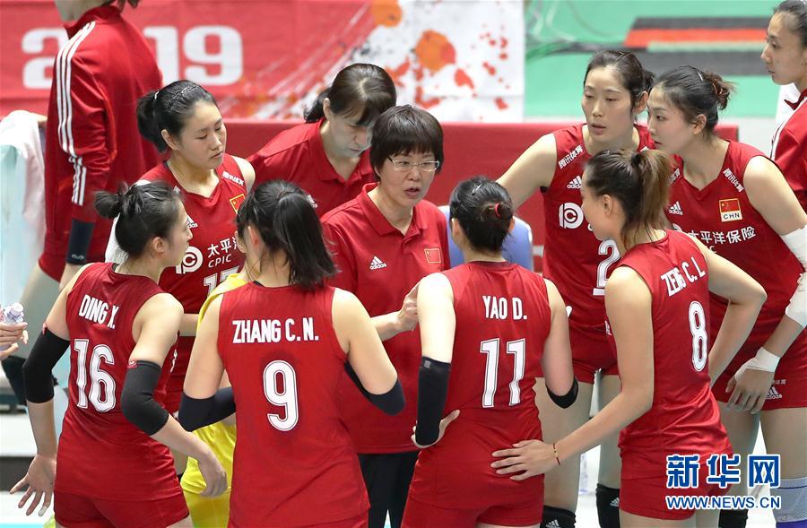 9月22日,中國隊主教練郎平(中)在比賽間隙指導球員。當日,在日本札幌舉行的2019年女排世界杯賽第二階段A組循環(huán)賽比賽中,中國隊以3比2戰(zhàn)勝巴西隊。新華社記者杜瀟逸攝