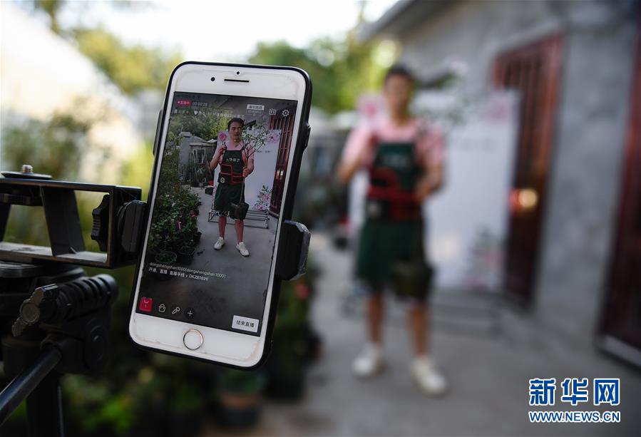 張炎在位于沭陽(yáng)縣新河鎮(zhèn)新槐村的家中直播銷售月季花(8月24日攝)。 新華社記者 李響 攝