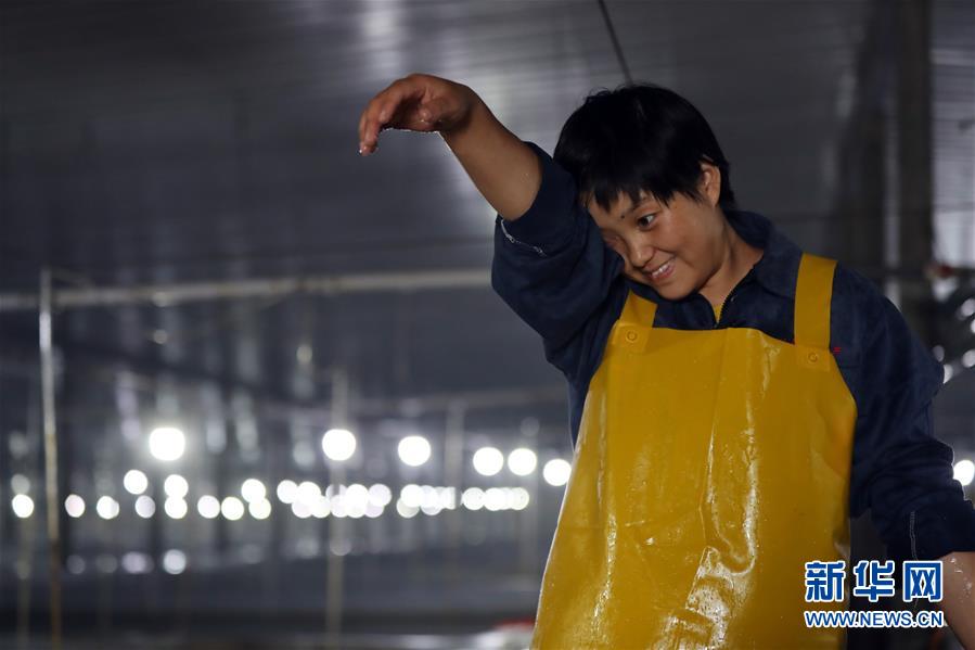 郭旗在魚棚擦去濺在臉上的水滴(9月5日攝)。 新華社記者 楊青 攝