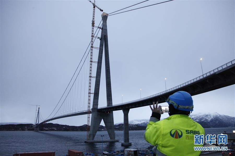 2018年12月9日,一名中國工人拍攝挪威哈羅格蘭德大橋。由中國四川公路橋梁建設集團(四川路橋)承建的挪威第二大橋哈羅格蘭德大橋位于挪威北部港口城市納爾維克附近,橋長1533米,是北極圈內最大跨徑懸索橋。該橋縮短了從納爾維克前往特羅姆瑟、哈爾斯塔等地的路程。新華社記者梁有昶攝