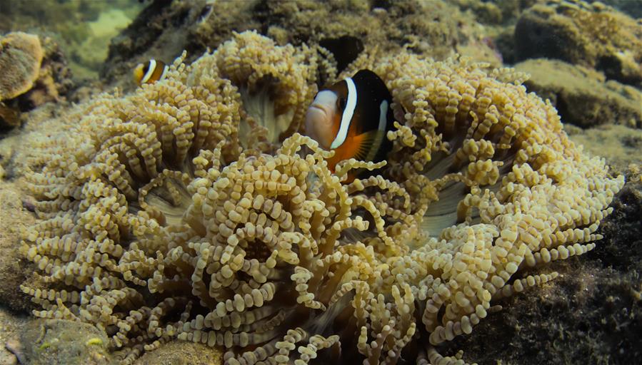 在分界洲島海域,小丑魚(yú)在??杏蝿?dòng)(10月4日攝)。