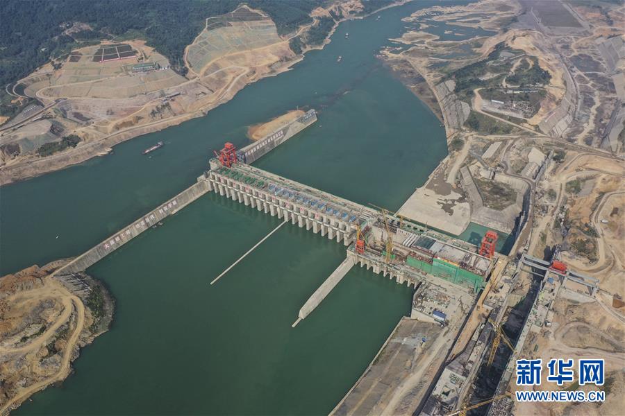建設(shè)中的大藤峽水利樞紐工程(10月6日無人機(jī)拍攝)。節(jié)日期間,工人們在位于廣西桂平市西江流域黔江河段的大藤峽水利樞紐工程現(xiàn)場加緊施工。新華社記者曹祎銘攝